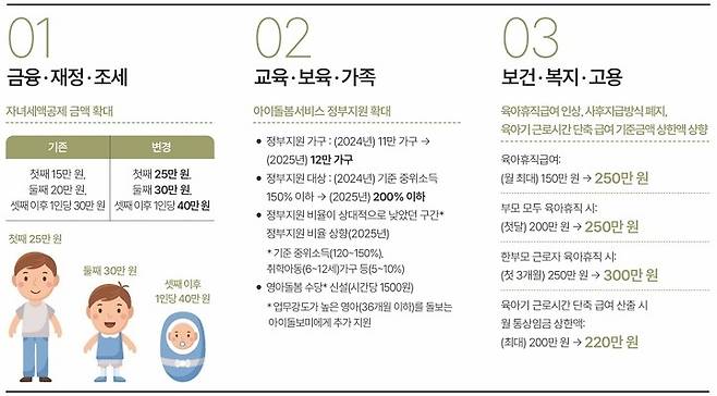 출산율을 제고하고 양육비 부담 완화를 위한 세제 혜택도 확대된다. 2024년 1월 1일 이후 기업이 근로자에게 지급한 출산지원금에 대해서 근로소득을 2025년 1월 1일부터 전액 비과세하고 자녀·손자녀(8~20세)에 대한 세액공제가 확대된다. 첫째는 15만 원에서 25만 원으로, 둘째는 20만 원에서 30만 원으로, 셋째 이후 1인당 30만 원에서 40만 원으로 각각 늘어난다.