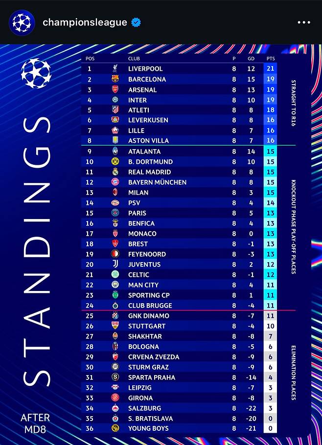 [SPORTALKOREA] 배웅기 기자= 시스템이 새로이 개편된 2024/25 유럽축구연맹(UEFA) 챔피언스리그(이하 UCL) 리그 페이즈가 막을 내렸다. 상위 8개 팀이 16강 직행을 확정 지은 가운데 9~24위 팀이 나머지 티켓을 놓고 '운명의 플레이오프'를 벌인다.