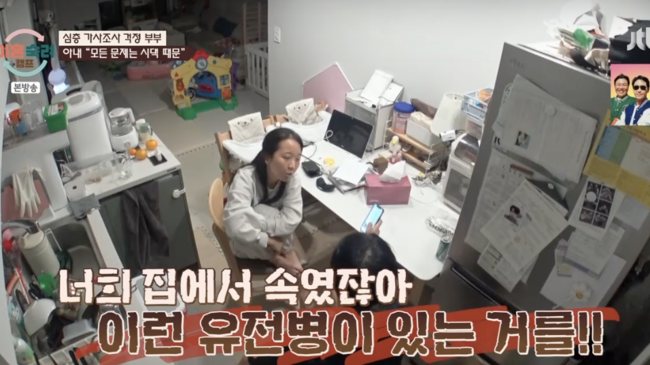남편은 “신경섬유종이란 병을 아이들 통해 알아, 그런 병명도 몰랐다”며 “회사에서 건강검진 받았을 때도 문제 없었다, 뭐라고 해명할지 모르겠다, 병원에서 문제 없다고 한다”고 했다. 하지만 아내는 “(유전병을) 속였다”며남편이 유전병을 속였다는 것.그러면서 “건강보험 외가쪽 싹 다 떼어와라 병원간 이력 다 있을 것,.본인들이 다 저지른 일”이라며 시댁까지 발생한 말싸움.