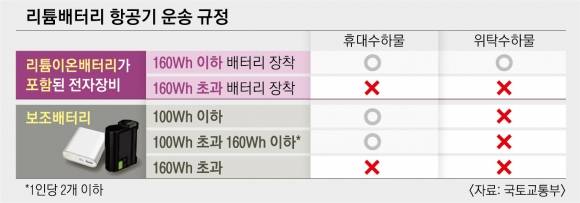 항공 위험물 운송기준에 따르면 리튬메탈배터리와 리튬이온배터리는 위험물로 분류돼 기내 휴대나 위탁수하물 반입이 기본적으로 금지된다.