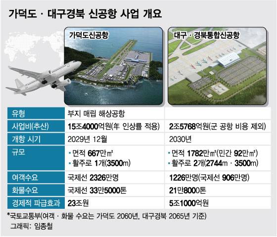 공항 건설에는 천문학적인 비용이 투입된다. 바다를 매립한 해상 공항 형태인 가덕도신공항에 투입되는 사업비는 13조7000억원, TK신공항에는 11조5000억 원이 들어갈 것으로 추산된다. 제주 2공항에는 6조7000억 원, 다른 공항 건설비용은 4조원이 투입될 예정이다.