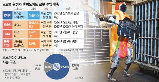 아틀라스가 현장에 투입되면서 거대한 휴머노이드 로봇 시장을 선점하기 위한 각축전이 시작됐다는 분석도 나온다. 일론 머스크 테슬라 최고경영자(CEO)는 지난해 “(2025년) 1000대 또는 수천 대 이상의 옵티머스 로봇이 테슬라에서 일하게 될 것”이라고 했다. 계획대로라면 테슬라는 올해 최소 1000대 이상의 휴머노이드 로봇이 생산 현장에서 일을 한다. BMW도 지난해 7월부터 피규어AI의 휴머노이드 로봇 피큐어02를 부품 조립과 운반, 판금 검사 등에 투입해 실제 작업을 수행하고 있다. 중국의 지리자동차와 비야디(BYD)도 자국의 휴머노이드 로봇 기업 유비테크로보틱스의 ‘워커S(WalkerS)’를 지난해부터 공장에서 실증하고 있다.