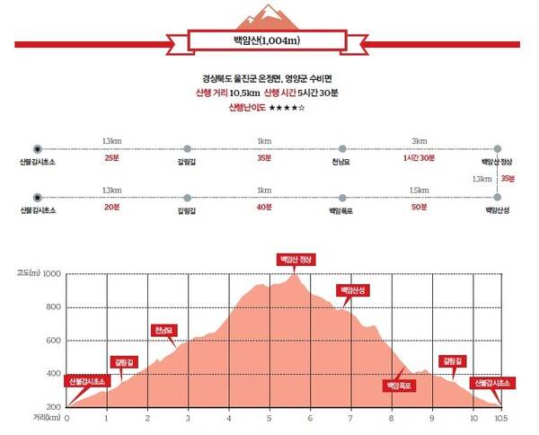 백암산은 정상부의 하얀빛의 바위 덕에 '흰 바위산'이라는 이름이 붙었다. 1,004m의 높이를 가져 일명 '천사산'이라고 불리기도 한다. 정상석 1,004m라는 숫자 밑에는 온천 표시가 붙어 있었다. 백두대간의 낙동정맥에 속한 백암산은 산체가 크고 깊은 계곡을 품고 있는 온정면에서 가장 높은 산봉우리다. 능선 빼곡히 숲을 이루는 금강송의 풍경이 정겹고도 웅장해 '금강송숲길'이라 불리며 걷기 좋은 길로 유명하다.