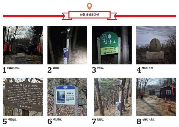 1.3km를 걸으면 나오는 갈림길에서 오른쪽으로 가면 천냥묘를 지나 정상으로 가는 길이 나오고, 왼쪽으로는 백암폭포를 지나 정상으로 갈 수 있다. 내일 일출 산행을 천냥묘 쪽으로 오르기로 하고 오늘은 백암폭포를 구경가기로 했다. 정상 찍고 내려오는 등산로는 천냥묘 길로 올라 백암폭포 길로 하산하는 코스가 일반적이다. 두 길 모두 5km 내외로 각각 2시간 30분 정도, 총 5시간 내외가 걸리는 원점회귀 코스이다. 이 코스를 따라 현위치번호 표지판이 1번부터 순서대로 붙어 있어 길을 찾는 것도 어렵지 않다.