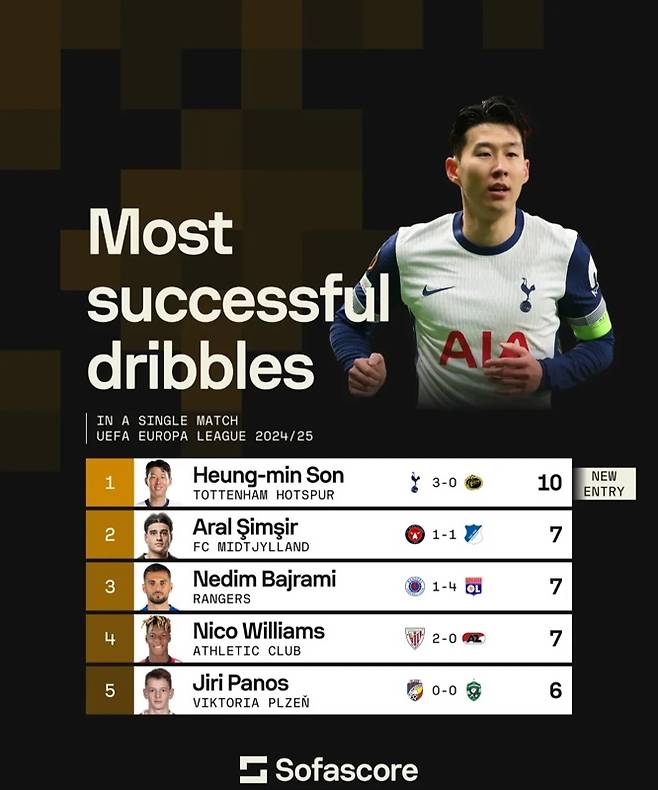 경기 후 반가운 소식이 전해졌다. 전반 45분을 소화하며 맹활약을 펼친 손흥민이 유로파리그 최초 기록을 수립했다는 내용이었다. 통계 매체 '옵타'는 이날 손흥민이 첫 45분 동안 드리블 11번 시도 가운데 10번 성공했음을 알렸다. 이는 대회 역사상 단 한 번도 나오지 않았던 진기록이다.