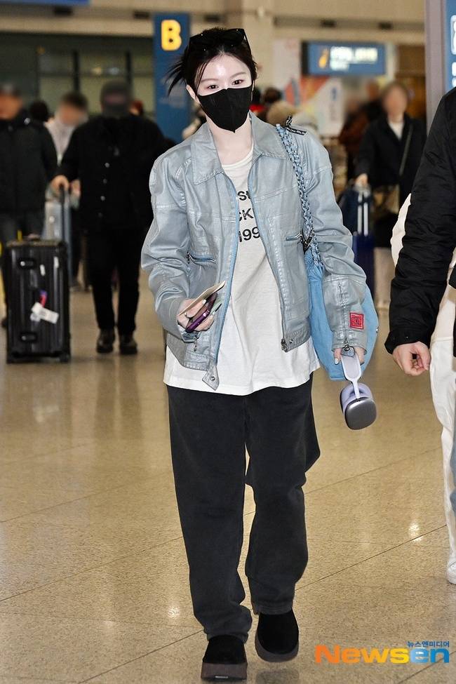 이날 고윤정은 흰색 티셔츠에 편안한 와이드핏 바지, 하늘색 가죽재킷을 입은 채 입국장에 등장했다.