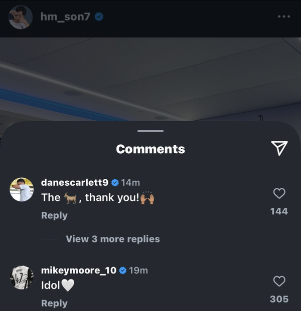 영건들은 곧바로 화답했다. 스칼렛은 스포츠계에서 최고의 선수를 빗대어 표현하는 염소 이모티콘(GOAT)을 사용하며 “감사하다”고 답글을 남겼다. 무어 또한 “IDOL”이라는 짧고 굵은 답글을 남기며 손흥민의 찬사에 화답했다. 손흥민에게도, 토트넘에게도, 영건 3인방에게도 특별한 경기였다.