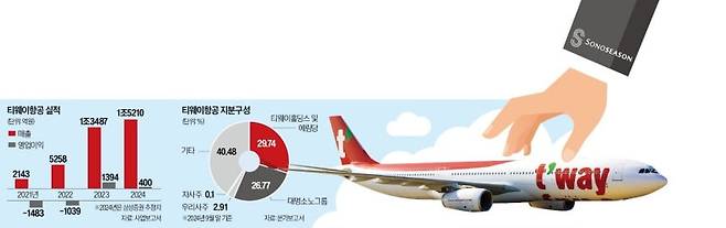 대명소노는 지난해 사모펀드(PEF) 운용사 JKL파트너스로부터 티웨이항공 지분 26.77%를 약 1897억원에 사들여 2대 주주에 올랐다. 최대주주인 티웨이홀딩스(홀딩스의 최대주주는 예림당)는 지분 30.09%를 보유 중이다. 대명소노와 예림당의 지분 격차는 3.32%포인트에 불과하다.