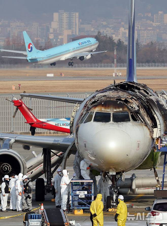 이 화재는 지난 28일 오후 10시26분께 김해국제공항 계류장에 있던 홍콩행 에어부산 BX391편 항공기(기종 A321) 후미 선반에서 발생해 약 1시간 만에 진화됐다. 불이 나자 승객 170명(탑승정비사 1명 포함), 승무원 6명 등 총 176명 전원이 무사히 탈출했다. 2025.01.31. yulnetphoto@newsis.com