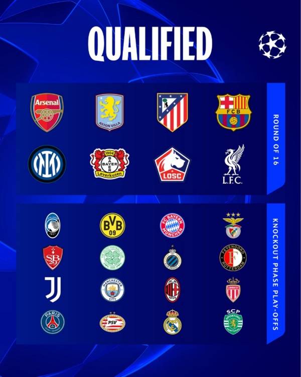 확정된 순위에 따르면 리버풀(잉글랜드)·바르셀로나(스페인)·아스널(잉글랜드)·인터밀란(이탈리아)·아틀레티코 마드리드(스페인)·레버쿠젠(독일)·LOSC 릴(프랑스)·애스턴 빌라(잉글랜드)가 1~8위로 16강 직행에 성공했다.