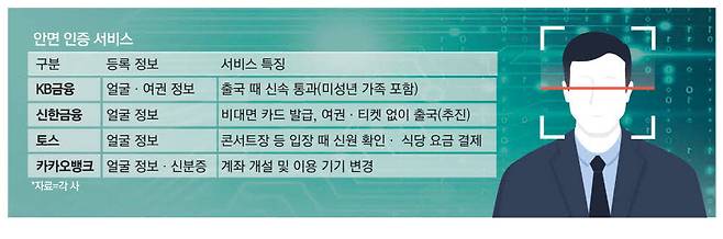 KB국민은행은 지난해 7월 '스마트패스' 서비스를 시작했다. 스마트패스에 안면과 여권 정보를 사전 등록하면 얼굴 인식만으로 출국장 게이트를 통과한 뒤 비행기에 탑승할 수 있다. 본인의 스마트패스에 7~14세 미만 자녀도 등록 가능하다. 가족 구성원 모두가 신속하게 출국할 수 있는 것이다. 이 밖에 신한·하나·우리·NH농협은행 등이 얼굴 인증 서비스에 힘주고 있다.