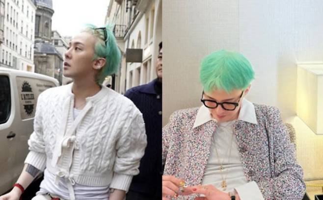 빅뱅 지드래곤이 민트색 헤어스타일을 공개하며 또 한 번 독보적인 스타일링을 선보였다.