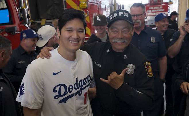 오타니와 동료들은 이날 69번 소방소에 있는 소방관들과 일일이 악수를 나누고, 함께 사진을 찍는 등 화기애애한 시간을 가졌다. 이들은 또 LA 소방국을 위해 총 36만 달러의 성금을 기부하는 시간도 가졌다.