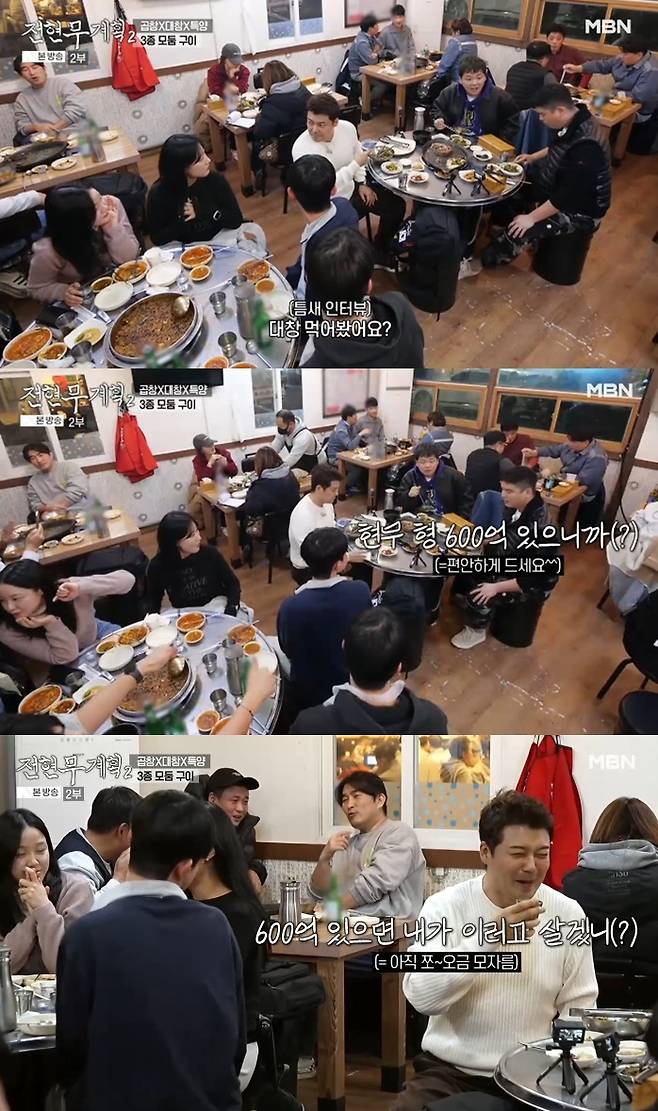 이날 전현무는 곱창집에 도착해 옆 테이블에 “대창 구이를 먹어 봤냐”고 물었다. 옆 테이블 사람들이 먹지 않았다고 대답하자 전현무는 “여기는 대창 구이를 먹어야 한다. 시켜주겠다”며 주문을 했다.