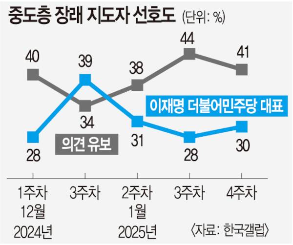 중도층이 장래 정치 지도자 선택을 뒤로 미루는 현상도 주목 대상이다. 한국갤럽의 장래 정치 지도자 선호도 조사에서 중도층의 ‘의견 유보’ 응답은 지난해 12월 3주차 34%에서 1월 4주차 41%까지 상승했다. 중도층 절반 가까이가 아직 차기 대선 주자를 고르지 못하고 있는 상황으로 해석될 수 있다.