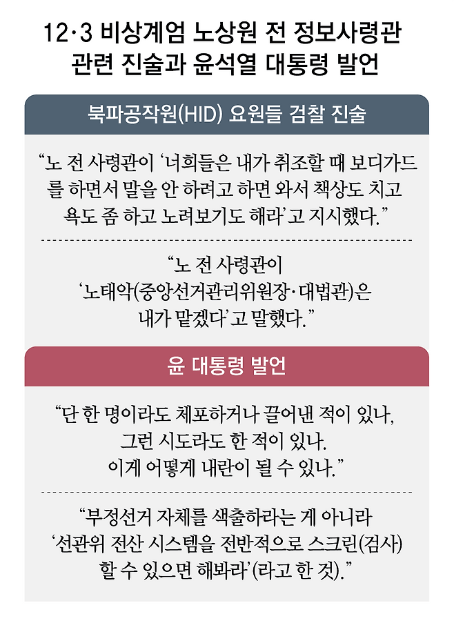 HID 요원들은 검찰에 노 전 사령관이 “노태악(중앙선거관리위원장)은 내가 맡겠다”고 말한 사실도 진술했다고 한다. 검찰은 이를 감안하면 노 전 사령관이 선관위 관계자들을 체포한 뒤 직접 취조하려 했을 가능성이 있다고 보고 있다.