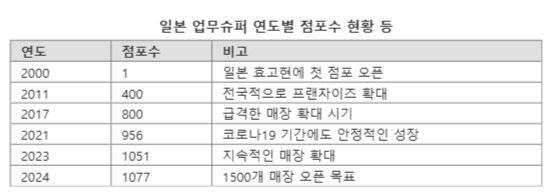 업무슈퍼는 초저가 상품 공급을 위해 박스를 그대로 매장에 진열하고, 부실한 식품 기업을 인수해 자체브랜드 상품을 만드는 전략으로 사세를 키워갔다. 2011년 일본 전역에 400개 점포에서 2017년 800개, 2023년 1051개 점포로 확대했다. 올해 3·4분기 기준 점포수는1077개다. 운영사인 고베물산의 순이익도 2023년 11월~2023년 4월까지 전년대비 36% 증가, 상반기 기준 최고치를 달성했다.