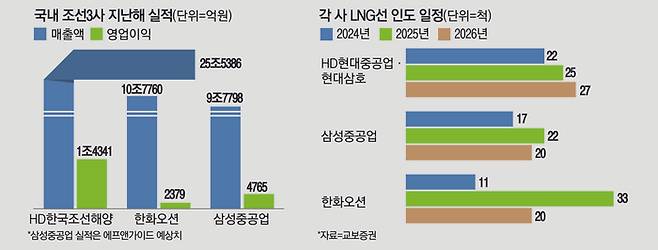 HD현대중공업과 HD현대삼호는 지난해 LNG선 22척을 인도했다. 올해는 이보다 3척 많은 25척의 LNG선 인도가 예정돼 있다. 삼성중공업과 한화오션도 올해 각각 22척, 33척의 LNG선을 인도할 것으로 전망된다.