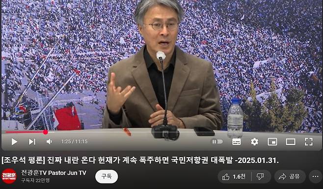 | ▲ 조우석 전 KBS 이사가 지난달 31일 유튜브 채널 '전광훈TV'에서 발언하는 모습. |