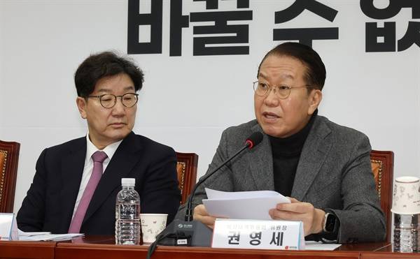 | ▲ 국민의힘 권영세 비상대책위원장(오른쪽)이 31일 국회에서 열린 비상대책위원 회의에서 발언하고 있다. |