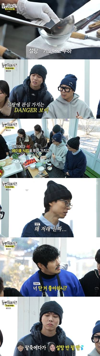 이를 지켜보던 주우재는 "저기에다 메이플시럽을 뿌려 가지고"라면서 군침을 다셨다. 이를 들은 유재석은 "저기다 왜 뿌리냐"라며 질색했다.