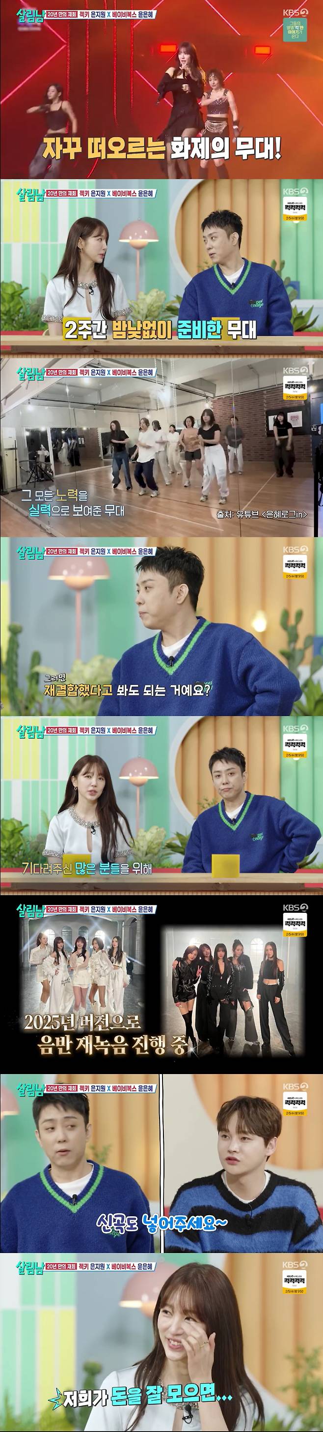 이날 해외 일정으로 자리를 비운 백지영을 대신해 '살림남'의 스페셜 MC로 출격한 윤은혜는 은지원과 약 20년 만에 재회했다고. 특히 윤은혜는 최근 화제가 된 가요대축제 무대에 대해 "2주 동안 밤새면서 연습했다. 그런 노력을 인정해주시는 것 같고, 실력도 늘었다고 해주시니까 뿌듯하더라"라고 소감을 전했다.