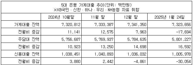 2일 금융권에 따르면 5대 은행(KB국민·신한·하나·우리·NH농협)의 지난달 24일 기준 가계대출 잔액은 732조3천656억원으로 집계됐다.