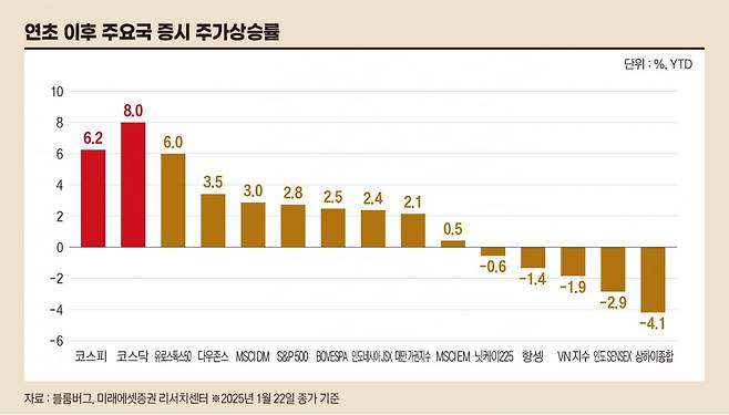2025년 국내 증시 시작은 나쁘지 않다. 대내외 불확실성에도 금리와 환율 등 매크로 지표들의 변동성이 둔화됐기 때문이다. 미국의 보편적 관세 우려도 완화됐다. 미국채 10년물 금리는 4.8%에서 4.6%, 달러 인덱스는 고점 대비 –1.5% 하락했다. 원·달러 환율은 1430원 중반 수준까지 낮아졌다.