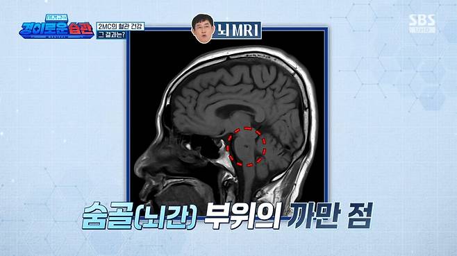 생각지도 못한 뇌경색 얘기에 이경규는 표정이 굳었다. 정진영 전문의는 "숨골은 뇌의 뿌리 같은 곳이다. 숨골에 문제가 생기면 마비, 안면 감각 상실, 발음이 어눌해지는 뇌졸중 증상이 생길 수 있다. 심하면 호흡을 관장하는 기능이 떨어지면서 최악의 경우 사망까지 이를 수 있다"고 말했다.