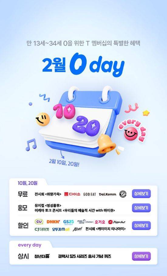 만 13세부터 34세에 해당하는 '0(영, Young)' 고객은 0 day 혜택도 누릴 수 있다. SKT는 매월 날짜 가운데 숫자 0이 들어가는 10일, 20일, 30일에 MZ 세대 선호 혜택을 무료 혹은 대폭 할인해주는 0 day 멤버십 프로그램을 운영 중이다.