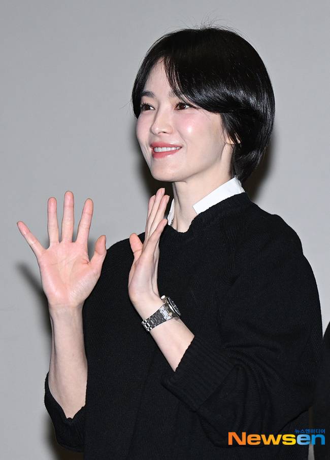 숏컷 스타일로 변신한 송혜교는 이날도 앞머리를 자연스럽게 넘겨 우아한 분위기를 냈다. 뽀얀 우윳빛 얼굴에 큰 눈망울, 사랑스러운 손인사가 팬들의 마음을 녹였다.