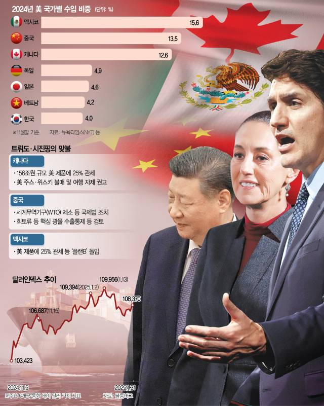 실제로 캐나다와 멕시코는 준비했던 대응을 즉각 발표했다. 쥐스탱 트뤼도 캐나다 총리는 이날 긴급 기자회견에서 3주 뒤부터 1550억 캐나다달러(약 155조 6000억 원) 상당의 미국산 제품에 관세를 부과한다고 밝혔으며 클라우디아 셰인바움 멕시코 대통령도 “플랜B 시행을 지시했다”며 즉각 보복관세에 나섰다.
