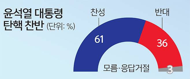 설 연휴 직전 실시한 1월4주(21∼23일·전화면접) 한국갤럽 정례조사와 비교하면 탄핵 찬성은 2%포인트 상승, 반대는 변화가 없었다.