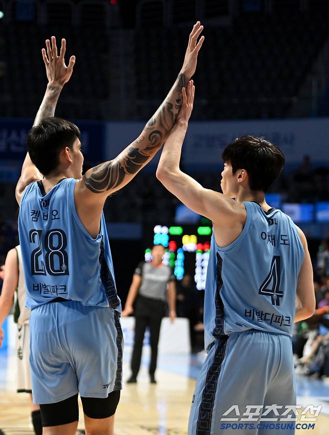 2일 고양 소노 아레나에서 열린 프로농구 고양 소노와 원주 DB의 경기, 소노가 86대82로 승리하며 4연패에서 탈출했다. 켐바오와 이재도가 기쁨을 나누고 있다. 고양=허상욱 기자 wook@sportschosun.com/2025.02.02/