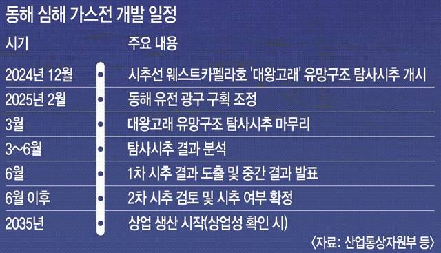 지난해 동해 석유·가스전 발견 발표 당시 정부는 탐사시추를 통해 매장량과 상업성을 확인하면 2027년 기반시설 건설을 시작해 2035년부터 상업 생산이 가능할 것으로 평가했다.