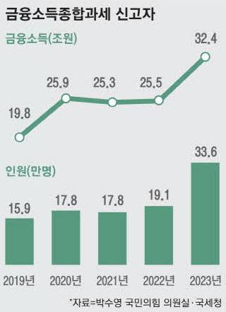 2일 국회 기획재정위원회 소속 박수영 국민의힘 의원이 국세청에서 제출받은 자료에 따르면 2023년 금소세 대상자는 33만6246명으로 전년(19만1501명)보다 75% 넘게 급증했다.