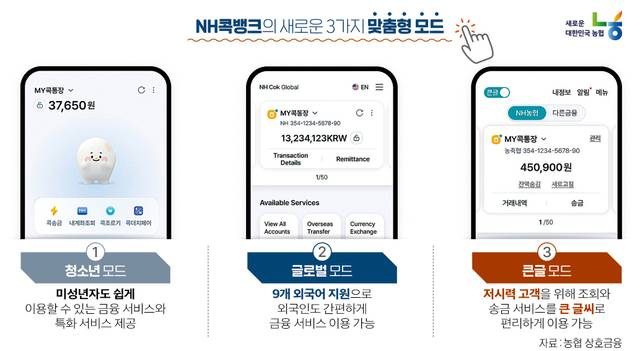 ◆ 아이부터 어르신까지 맞춤형 모드=농협 상호금융은 이번 개편으로 아이부터 어르신까지 모두 이용할 수 있는 쉬운 콕뱅크를 만들기 위해 팔을 걷어붙였다.