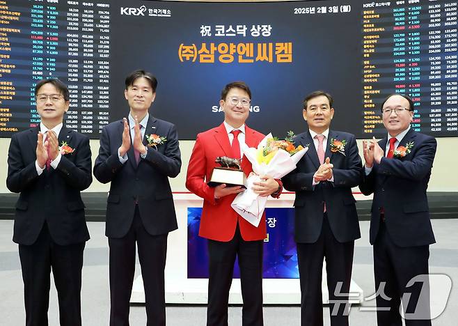 (서울=뉴스1) = 3일 서울 영등포구 한국거래소에서 열린 삼양엔씨켐 코스닥시장 상장기념식에서 김대영 한국IR협의회 부회장(왼쪽부터), 민경욱 한국거래소 코스닥시장본부장, 정회식 삼양엔씨켐 대표이사, 김성현 KB증권 대표이사, 강왕락 코스닥협회 부회장이 기념촬영을 하고 있다. (한국거래소 제공) 2025.2.3/뉴스1