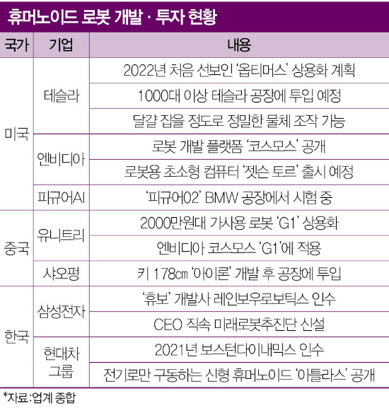 글로벌 기업 움직임도 바빠졌다. 미국 전기차 업체 테슬라는 수년 전부터 개발해온 휴머노이드 로봇 ‘옵티머스’를 올해 시험 생산해 자체 공장에 배치할 예정이다. 내년에는 대량 생산해 판매하는 것이 목표다. 미국 시장조사업체 BCC에 따르면 전 세계 로봇 시장 규모는 지난해 784억달러(약 114조원)에서 2029년 1652억달러(약 240조원) 수준으로 성장할 전망이다.