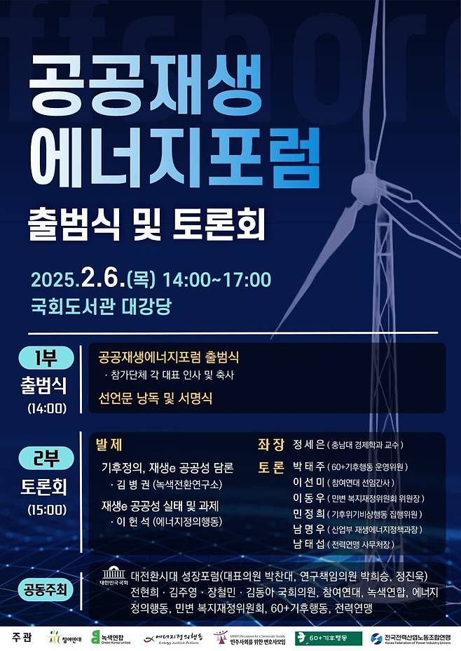 포럼에는 전력산업 노동자로 이뤄진 전국전력산업노동조합연맹, 기후위기 대응과 에너지 전환을 위해 노력해온 민주사회를위한변호사모임, 참여연대, 녹색연합, 에너지정의행동, 60+기후행동 등 기후운동과 시민사회가 함께 참여한다.