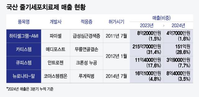 앞서 허가된 품목들의 미미한 상업화 성과도 해당 우려에 힘을 싣는다. 4개 허가된 국산 줄기세포치료제 중 연간 100억원 이상의 매출을 거두는 품목은 카티스템(2023년 약 216억원)이 유일하다. 나머지 품목들의 경우 한해 10억원 안팎에 불과한 매출에 그치고 있다. 특히 지난해 들어선 전년 대비 매출액 규모와 각 사 실적에서 차지하는 비중 역시 줄어들며 존재감이 더욱 약해졌다.