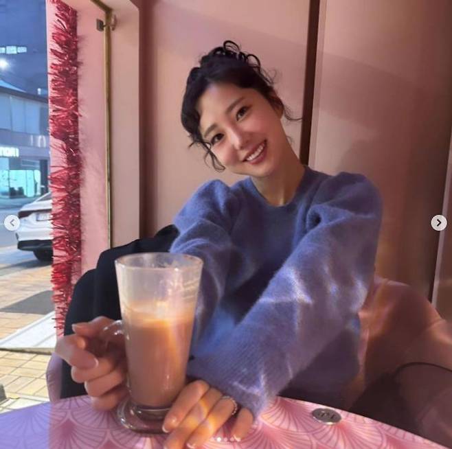 사진에서 김가영은 보라색 니트를 입고 커피 잔을 든 채 화사하게 미소 짓고 있다. 특히 사진 속 김가영의 약지에 끼워진 반지가 눈길을 끌었다.