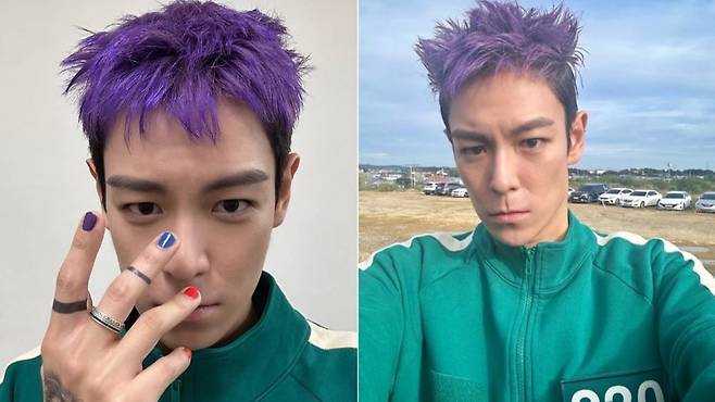 오늘(3일) 최승현은 자신의 계정을 통해 세 장의 사진을 공개했다. 공개한 사진들은 지난해 12월 공개된 넷플릭스 시리즈 '오징어 게임 2'의 비하인드 컷들이었다. 탑은 오징어게임 참가자들이 입는 녹색의 옷을 입고 타노스로 변신한 채 다양한 포즈로 사진을 찍은 모습이었다. 그중에서도 보라색 머리를 하고 손등에 화려한 문신과 형형색색의 네일 아트가 시선을 모았다.