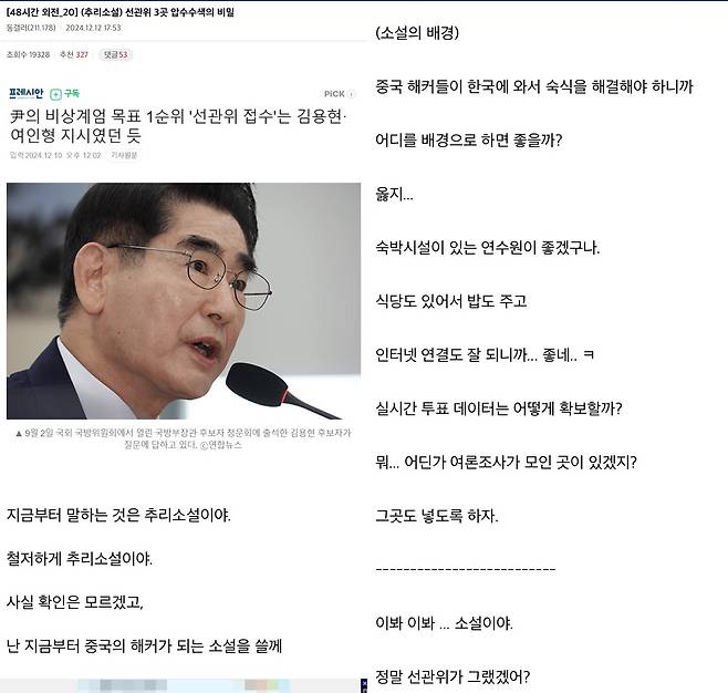 | ▲ 이른바 '48시간좌'가 지난해 12월 12일 디시인사이드 동덕여대 갤러리에 올린 글. '소설'에 빗대 12.3 내란 당시 계엄군이 투입된 선거연수원에 중국인 해커가 있었다는 부정선거 음모론을 제기했다. 이는 선거관리위원회와 주한미군 등에 의해 모두 허위 사실로 밝혀졌다. |