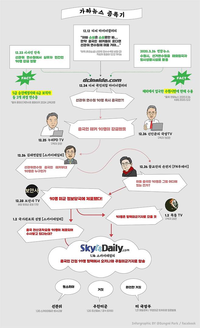 | ▲ 박성미 작가가 2일 자신의 페이스북에 올린 '가짜뉴스 증폭기' 인포그래픽. 지난해 12월 12일 디시인사이드 동덕여대 갤러리에 올린 이른바 '48시간좌'의 '소설'이 <스카이데일리> '선거연수원 중국인 해커 체포' 오보 원조라고 밝혔다. |