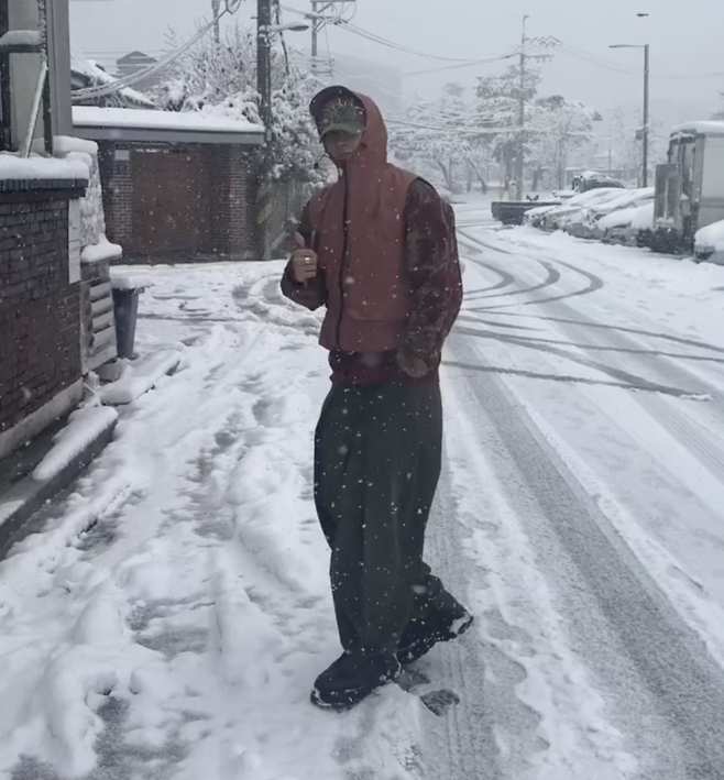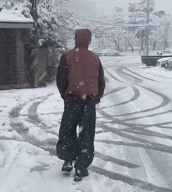 한겨울 눈이 쏟아지는 거리에서 추영우는 후드가 달린 나일론 조끼와 맨투맨을 레이어드해 보온성과 스타일을 동시에 챙겼다.