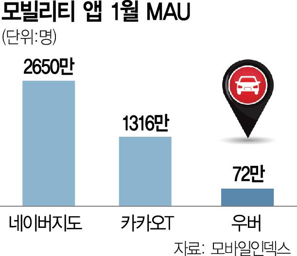 우버는 네이버 지도를 통한 접근성 강화로 새 이용자를 유입해 카카오모빌리티를 추격한다는 구상이다. 모바일인덱스에 따르면 네이버 지도 앱의 이용자는 2650만 명에 달한다. 모빌리티 플랫폼 국내 1위인 카카오모빌리티의 카카오T(1316만 명)보다 두 배 이상 많다. 우버 앱의 지난달 월간 활성화 이용자(MAU)는 72만 명으로 추산되는데 네이버 지도의 압도적인 이용자 수를 일부라도 끌어올 수 있다면 대폭 성장이 가능하다고 보고 있다.