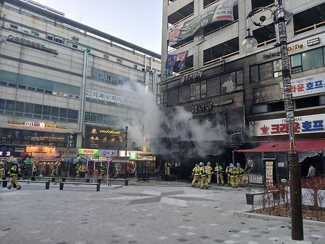 소방 당국에 따르면 이날 오후 4시57분쯤 난 화재로 현지 술집 관계자 2명과 상가 이용객들이 대피했다. 소방 당국은 장비 33대와 소방관 90여명을 투입해 화재 발생 35분 만에 큰 불길을 잡았으며 오후 6시20분쯤 완전히 진화했다.