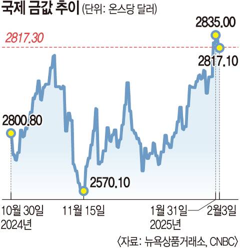 투자자 자금이 안전자산으로 몰리면서 금 가격은 사상 최고치를 경신했다. 미국 CNBC방송에 따르면 금선물 가격은 지난달 31일 뉴욕상품거래소(COMEX)에서 온스당 2835.00달러까지 치솟았다. 전고점인 지난해 10월 30일의 2800.80달러를 3달 만에 갈아치웠다.