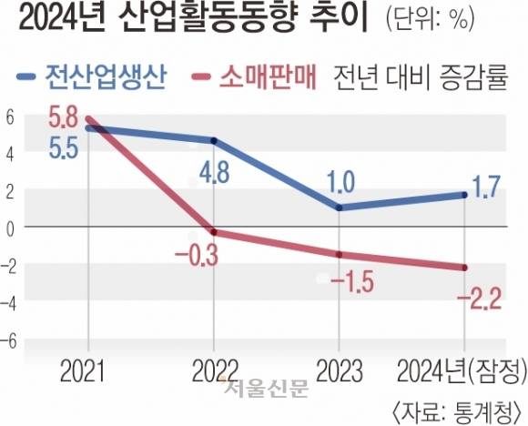 통계청이 3일 발표한 ‘2024년 및 12월 산업활동동향’에 따르면 지난해 소매판매액지수는 101.6(2020년=100)으로 전년 대비 2.2% 감소했다. 신용카드 대란 사태가 있었던 2003년(-3.2%) 이후 21년 만에 가장 큰 폭의 감소다.
